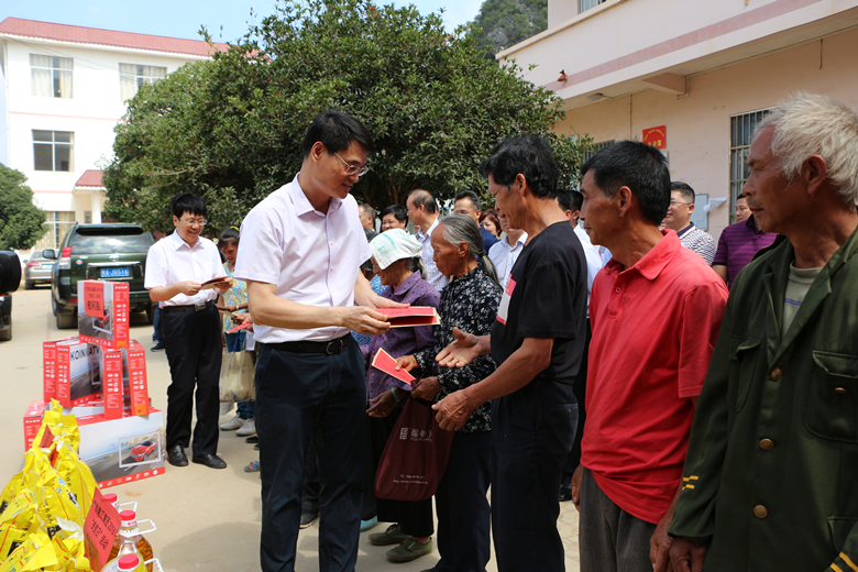 10月17日,按照广西建工集团扶贫领导小组办公室安排,集团董事长、党委书记金宁运和总经理、副董事长、党委副书记罗涛,带领集团班子成员、中层领导干部及各子公司领导干部职工一行190多人,深入靖西市新甲乡仁龙村、甲赛村、孟求村、大进村和禄峒镇远猛村5个驻点帮扶村,开展广西建工集团2016年“扶贫日”帮扶活动,公司总经理、党委副书记龙安宝,党委副书记、纪委书记、工会主席黄水保,副总经理、总工程师李友胜以及公司工会、南宁分公司相关负责人参与了集团扶贫帮扶活动。