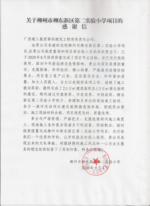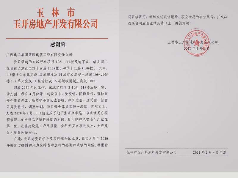 | 四建公司一项目收到业主表扬信 |